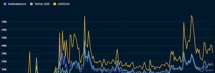 在以太坊網絡上,Tether(USDT)是目前市值最高的穩定幣,并以巨大的市場優勢主導著穩定幣流通。就交易量而言,USDT的交易量幾乎是USDC和DAI總和的兩倍。然而,在Fantom網絡上,占據主導地位的穩定幣卻是USDC和DAI,USDT位列第三,這表明在Fantom上尚未出現占據主導地位的穩定幣市場領導者,因此關注下未來穩定幣在Fantom上的表現一定會很有趣。在Fantom上USDC和DAI在交易量方面處于領先位置,如下圖所示,USDC在交易數量和日均活躍用戶方面均遙遙領先,從這可以看出,USDC是Fantom區塊鏈上的首選穩定幣。Fantom區塊鏈上穩定幣活動的飆升勢頭表明其使用率正在逐漸增加,尤其是Fantom在9月宣布了流動性挖礦激勵計劃之后,使得該月穩定幣活動呈爆炸性增長。穩定幣數量的增加是一個積極的指標,因為這意味著Fantom鏈上擁有充足的流動性,用戶可以采用比以太坊主網上更加復雜的策略,而且成本更低,速度明顯更快。然而,在9月下旬,也就是整個加密貨幣市場出現下滑期間,Fantom上的穩定幣活動同樣沒有逃過下降的命運。