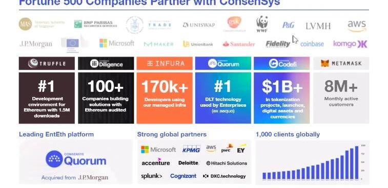以下為CharlesdHaussy演講全文,由Odaily星球日報整理:大家好,我是ConsenSys的亞太區董事總經理CharlesdHaussy。ConsenSys的產品線包括ConsenSysQuorum和MetaMask錢包,想必今天在場的許多朋友都用過我們的產品。很高興今天能夠向大家介紹ConsenSys上的NFT,在開始之前,我需要先來介紹一下ConsenSys。我們是一家從很早開始就在積極參與以太坊生態建設的公司,我們的受眾主要有三種,一是開發者,一是企業,三是終端消費者。本質上,ConsenSys在所做的是降低使用區塊鏈的難度,使開發者及用戶能夠更方便地建設或體驗區塊鏈。我們正在與許多機構、企業、項目密切合作,包括新加坡金管局、香港金管局、富達、Coinbase、Maker等等。
