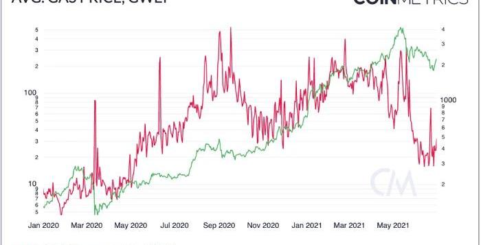 對于以太坊來說,最近最受關注的就是gas費用出現大幅下降,目前已降至2020年3月以來的最低水平。雖然幾個月前gas平均價格經常達到150-200GWEI,但自5月底以來已降至15-30GWEI范圍。