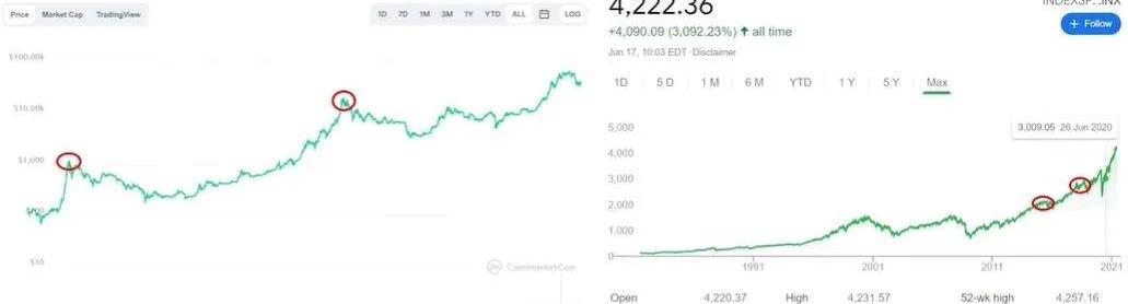 有趣的是,當我們將加密貨幣之前的市場周期與股市進行比較時,可以看到一個令人驚訝的相關性。