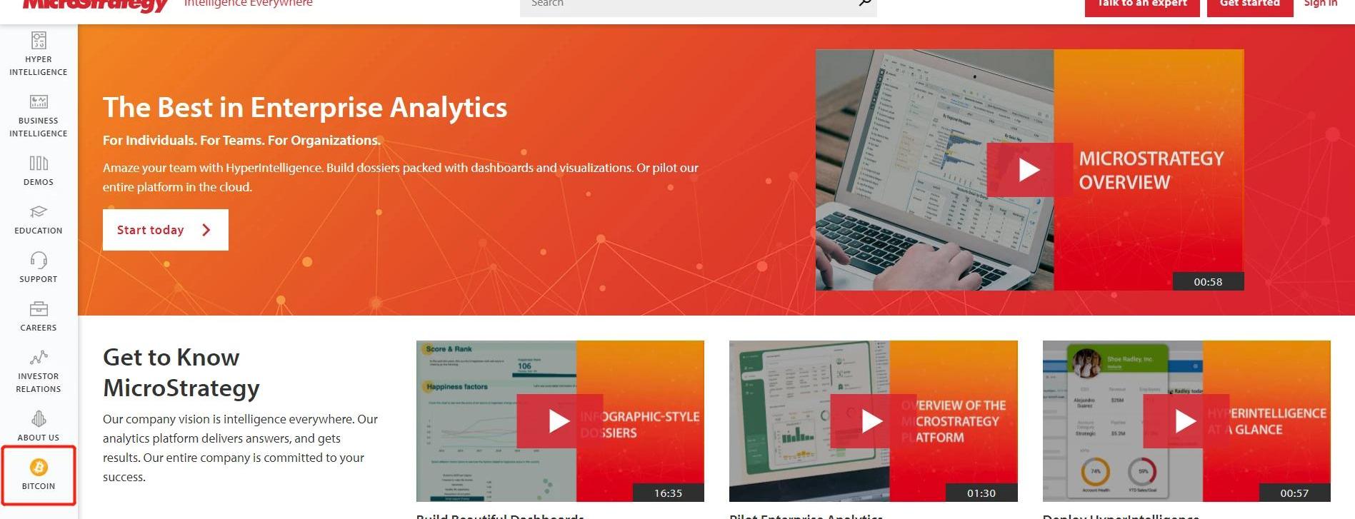 MicroStrategy官網頁面中含“BITCOIN”按鈕有趣的是,打開MicroStrategy的官網,首頁下方有一個“BITCOIN”按鈕,與公司的產品項同屬一欄,寓意比特幣投資是公司的主營業務。
