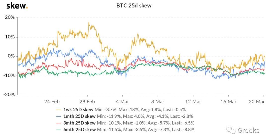 XRP/HKD+1.64%播報數據由Greeks.live和Skew.com提供。比特幣的大幅下跌一般有兩種形式,一種是加速上升然后突然閃崩,另一種是在某一支撐點位橫盤之后再次崩盤式下跌。目前比特幣在歷史最高點附近橫盤,形態很像是12月初的狀態,比特幣很少有在這個形態下暴跌的歷史。BTC歷史波動率10d74%30d84%90d93%1Y69%期權成交量10億美元,期權持倉量為120億美元。各標準化期限隱含波動率:今日:1m84%,3m92%,6m92%3/19:1m90%,3m96%,6m96%比特幣長時間的橫盤疊加進入交割周,造成各主要期限IV下降。目前月期權IV已經跌至85%以下,看好比特幣的投資者建立一些看漲期權倉位是劃得來的。