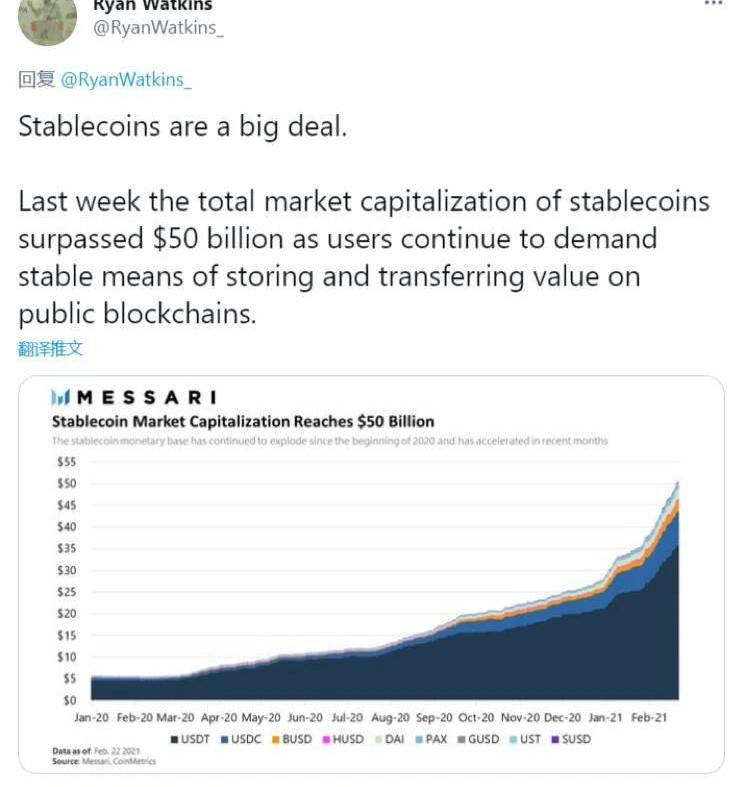 4.穩定幣很重要。上周,由于用戶依然需要以穩定的手段來在公有鏈上存儲和轉移價值,穩定幣的總市值超過500億美元。