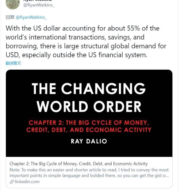 7.當前美元約占全球國際交易、儲蓄和貸款的55%,因此全球對美元的結構性需求很大,尤其是在美國金融體系之外。