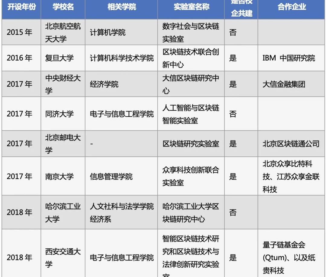 數據來源:學校官網,公開信息,零壹智庫注:1、以開設課程時間升序排列;2、“-”表示數據缺失。2、高校區塊鏈實驗室6成為信科院設立,7成為校企合作2020年5月,教育部印發的《高等學校區塊鏈技術創新行動計劃》提出,“到2025年,在高校布局建設一批區塊鏈技術創新基地,培養匯聚一批區塊鏈技術攻關團隊。”早在2015年,一批高校就開始建設區塊鏈實驗室。除了校內“封閉式”課程,高校通過設立實驗室或者創新中心加強“產學研”之間的交流與合作。高校實驗室分為“自主成立”和“校企合作”兩種。前者為“在當地政府和學校的支持下,一些高校的學科帶頭人設立實驗室,邀請其他專業、高校共同研究課題”。后者為“企業出于推廣品牌、吸引人才、共享研究成果等需求,向高校出資設立實驗室。實驗室由校方教師與企業高管共同管理”。根據01區塊鏈、零壹智庫不完全統計,截至2020年11月底,高校實驗室中近7成為校企合作,剩余11個為自主成立。合作的企業大多為區塊鏈頭部公司,如北京眾享比特、紙貴科技、比特大陸等。在學校院系分布上,擁有區塊鏈實驗室的院系約6成為技術類,逾2成為經管類,近1成為法學類。在設立年份分布上,2018年和2019年為高校區塊鏈實驗室成立的高峰期。表2:中國高校區塊鏈實驗室列表