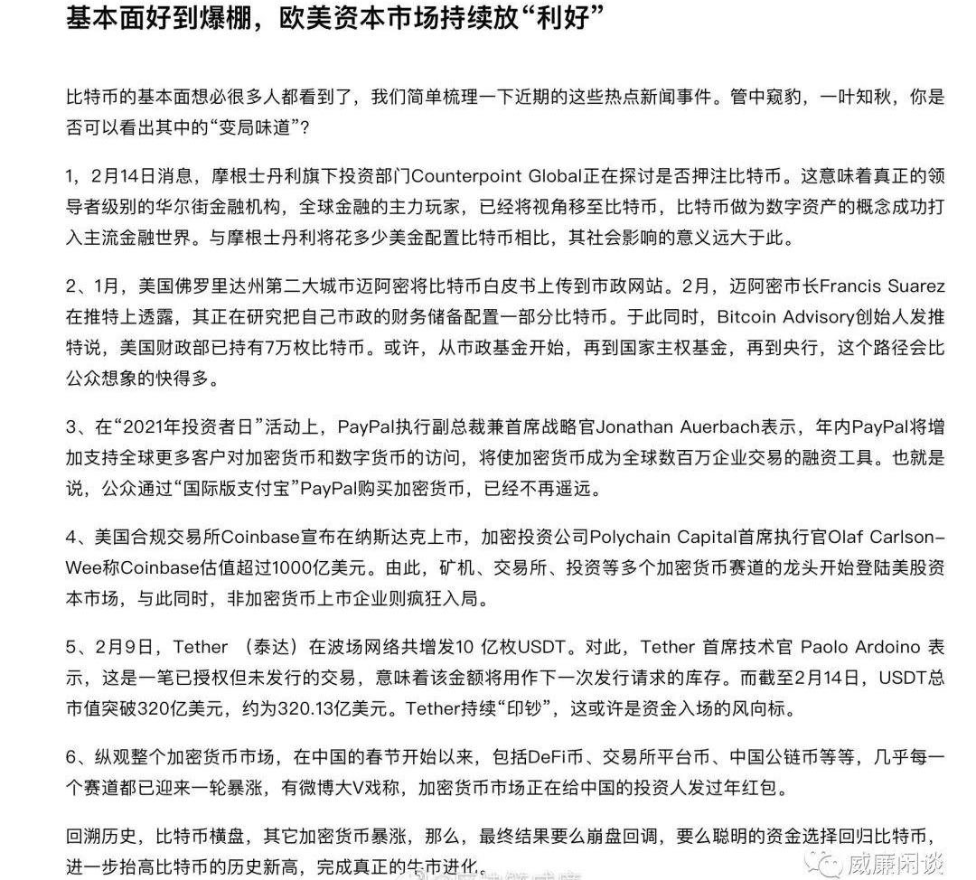 雖然因為種種原因吧,沒有以前年三十低點那么明顯了,但是顯然趨勢依然是如此的。比特幣突破并穩在了五萬美金上方,對很多人來說已經到了他們覺得的“終點”,我聽到很多人問我是不是應該止盈比特幣,去投資其他幣或者投資其他市場呢?這里我統一回復下這類問題:當你覺得你的比特幣倉位“被迫”漲到讓你特別關注它,漲跌都焦急的話,那你就適當賣些吧。牛市當然可以去買其他幣,但是你要記住市場上山寨千萬種,而你只看到每天漲幅榜上的就覺得大家都漲得很好是不合理的。投資是自己的事情,問我沒啥用。接下來聊聊為什么我覺得五萬美金才只是開始。很多做技術面研究的人喜歡說的一句話叫“行情是走出來的”,從技術面來分析趨勢總是會隨著價格變化而更加清晰。但是其實對于比特幣來講,它的“基本面”也是走出來的。隨著價格的上漲,它的基本面越來越好,投資者級別越來越高,資金規模越來越大,然后更加促進了它的上漲,進入一個很強的正循環。前兩天看到一篇文章夸比特幣的“基本面”好的,分享一段給大家: