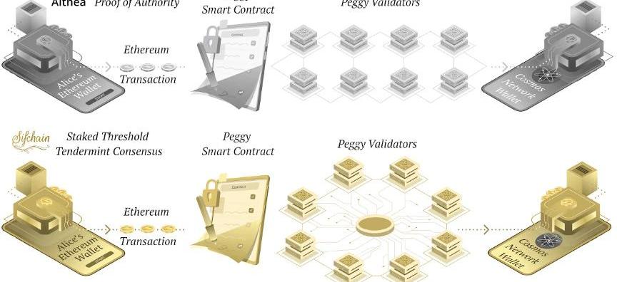 全鏈式去中心化交易所Sifchain宣布已在其測試網MonkeyBars上部署Cosmos-以太坊連接橋Peggy,并將在1月25日上線包含這一功能的Beta版主網和啟動代幣Rowan的公募。Sifchain是建立在Cosmos上的加密貨幣交易協議,將與20-25條主流區塊鏈進行跨鏈集成,從而簡化Cosmos社區的開發流程,讓后續的跨鏈集成能夠以極低的開發成本實現。Sifchain的目標是讓不同鏈間的跨鏈集成成為像錢包或區塊瀏覽器一樣的標配,讓人們可以在鏈上交易所有的加密貨幣,以及通過去中心化自治組織統籌部署所有加密貨幣的資金。Sifchain的連接橋Peggy建立在Cosmos主分支版本和SwishLabs團隊的補充開發之上。與Cosmos生態中Althea版本的Peggy一樣,Sifchain版本的Peggy也將能夠在Cosmos網絡的區塊鏈上創建ETH及以太坊其他ERC-20代幣的錨定代幣。具體而言,以太坊用戶從以太坊錢包發送代幣到運行在以太坊上的Peggy智能合約。維護Peggy智能合約的驗證者將會把以太坊代幣鎖定,并鑄造相應的錨定代幣發送給用戶在Cosmos網絡的錢包地址。不過,兩者在代幣經濟的安全模式上有區別。Althea版本Peggy使用的是權威證明。其中,用戶接受一些特定的預先任命的Peggy連接橋驗證者的信譽。如果這些驗證者宣布一筆跨鏈交易有效,則其就得到驗證。相反,Sifchain版本的Peggy采用質押門檻模式,即Peggy驗證者質押抵押品保障連接橋,并在連接橋的兩側——Cosmos側和以太坊側接受Tendermint共識的規則,在違規時將會遭到沒收抵押品的懲罰。這解決了Althea版本Peggy的經濟安全性問題。同時,Sifchain版本Peggy的驗證者能夠賺取一定的服務費。