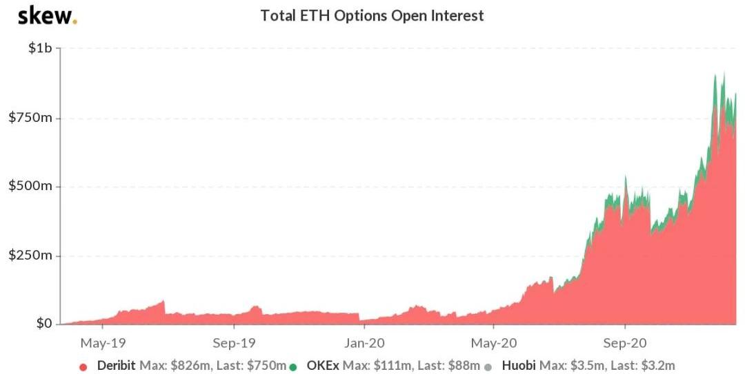數據來源:TheBlock盡管即將向PoS過渡,但以太坊的算力已經攀升至新高。換句話說,該網絡比以往任何時候都更加安全。根據TheBlock的數據,以太坊目前的算力已經超過271TH/s,超過了它在2018年9月的歷史高點約240TH/s,這是在熊市中達到的。隨著2021年7月難度炸彈的設定,礦工們在他們的挖礦設備被“變磚”之前吞盡量去挖所有剩余的ETH。但社區是否需要再一次推遲難度炸彈的時間,則是另一個問題。即使所有以太坊2.0階段都在并行工作,這應該會比最初的0階段推出的速度快得多,但網絡在未來六個月內轉向PoS似乎還是不太可能的。3.ETH期權開放興趣創歷史新高
