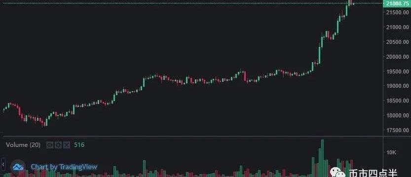 比特幣突破20000后持續上漲,在過去15小時內再度取得了近2000美元的上漲表現,階段漲幅超9%,而在20000關口破位前行情取得上一波類似漲幅花了整整5天。