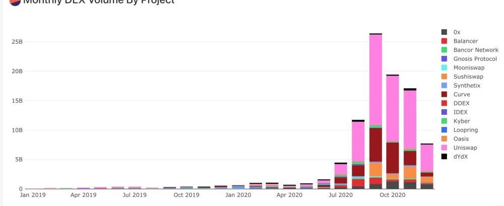 自2019年以來,去中心化交易所的月交易量已大幅增長。DEX交易所通過對總交易量收取少量費用實現盈利。