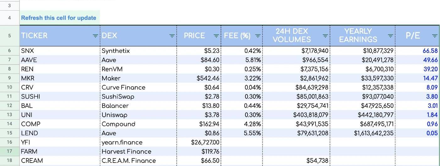 市盈率低的公司通常被認為是價值股票。這意味著它們被低估了,因為其股價相對于基本面而言處于較低水平。這種定價錯位會促使投資者在市場進行修正之前購買該股票。股票價格如果如期上漲,投資者則能成功“抄底”獲利。眾多項目中,Uniswap市盈率基本是最低的一檔,因為其年化交易量最高。Uniswap是一個去中心化交易協議,以其在促進DeFi代幣自動化交易中的作用而聞名。通過自動化做市流程,該協議通過限制風險和降低各方成本來激勵交易。該機制還消除了用戶的身份要求,從技術上講,任何人都可以為任何一個交易對創建流動資金池。根據Uniswap的說法,其創建治理代幣的目的是“讓Uniswap正式包含在公有且可自我維持的基礎結構中,同時繼續謹慎地保護其無法摧毀和自治的特性。”從純粹的分析角度來看,即使UNI持有人沒有直接從手續費分紅中受益,他們也有動力確保Uniswap成為市場上最具競爭力的DEX,這使UNI代幣與SNX代幣相比具有相對的競爭優勢。未來的治理將比那些P/E指標發揮更大的作用。最后,通過這個方法,我們可以計算很多項目的市盈率,大家可以點擊GoogleSheets自行填入數據進行計算。