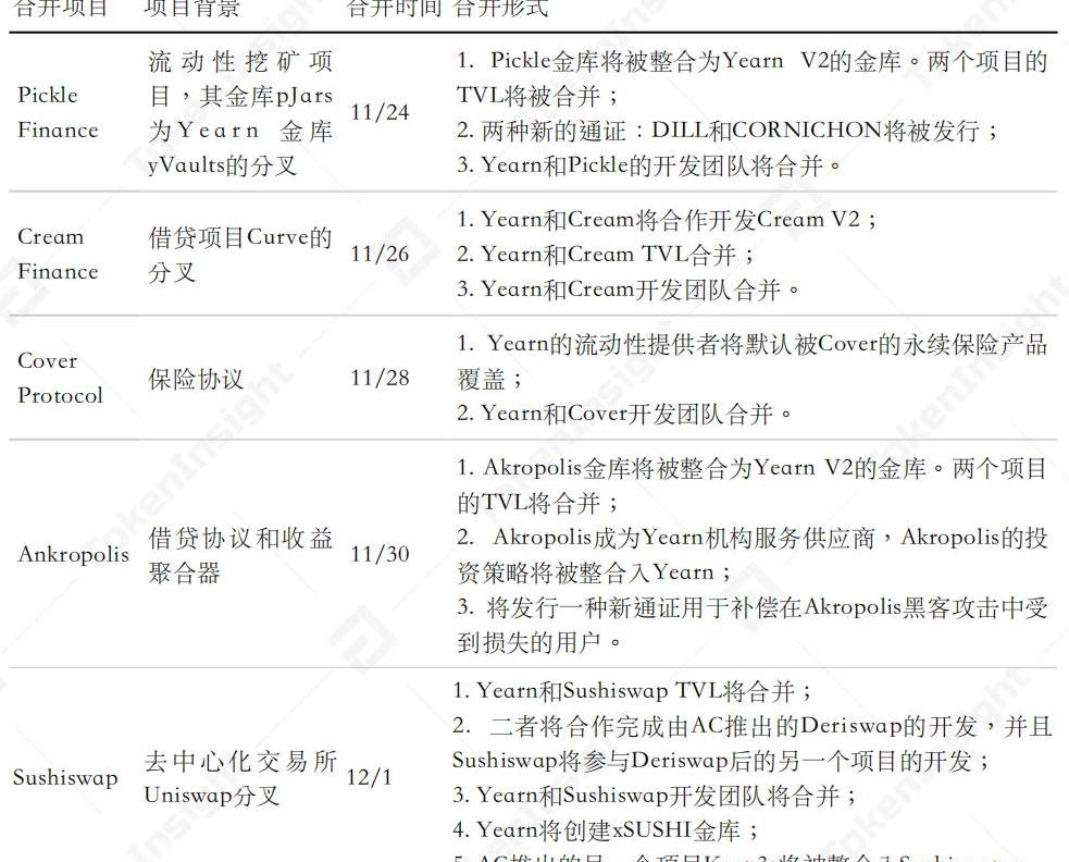2020年11月24日,Yearn宣布與PickleFinance合并。由于該起合并是DeFi史上的第一次合并,且Yearn、Yearn創始人AC和“食物”項目本身就具有很高的社區熱度和討論度,該合并在宣布后引起了廣泛的關注。然而,Yearn的合并目標并不僅僅只有Pickle,在此后的一周,Yearn接連宣布了5起合并,合并項目覆蓋包括借貸、交易、保險、收益聚合等在內的DeFi生態中的多個領域: