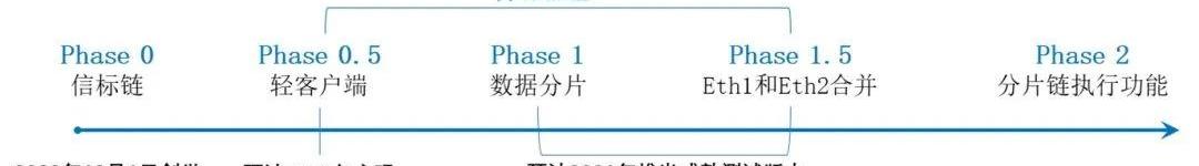 其中,Phase0的主要任務是推出以PoS為共識機制的信標鏈。信標鏈的主要職能包括希望成為Eth2的驗證者參與到質押系統,代替礦工的角色而成為新鏈的構建者與驗證者;以及完成分片鏈之間的通信交互,并協調各分片鏈共同打造一個區塊鏈系統。按照最初的規劃,信標鏈的推出對于大多數用戶不會產生直接影響,因為它不會直接處理交易、執行智能合約或支持去中心化應用。這樣設計的初衷是為了確保,Eth2不會擾亂現有的Eth1已經形成的生態。在Eth2的性能被反復驗證前,現有的以太坊網絡將繼續存在,與Eth2并行運行。在Eth2的發展過程中,現有網絡也將不斷升級,直到Phase1.5實現Eth1和Eth2的合并。也就是說,短期內Eth1和Eth2將會并存,PoS和PoW兩種機制也將在以太坊網絡并行。Phase1則將主要解決以太坊的交易擁堵問題,提升可拓展性。具體來說,就是在這一階段正式引入分片鏈,每條鏈之間相互獨立,通過信標鏈實現交互通信。理論上,64條分片鏈一次性可以處理64個區塊,相較當前一次只能打包一個區塊的以太坊,將大幅提升交易效率,緩解網絡擁堵問題。Eth1也將在這個過程中并入Eth2,并作為64條分片鏈中的一條獨立運行。但由于Eth1與其他新的分片鏈存在本質不同,其中牽扯到包括共識機制轉變、已有數據與應用的遷移等諸多問題,所有這一過程也被稱為Phase1.5。Phase2是Phase1的延續,將繼續執行分片機制。各條分片鏈在這一階段開始正式執行各項功能,并全面引入智能合約和各類應用,實現Eth2的最初設想。這一路線圖中,Eth2最終將形成由信標鏈敲定驗證和完成分片間通信,由分片鏈并行處理交易的系統,實現交易處理與共識驗證的松耦合。但在11月18日以太坊基金會團隊第五次AMA上,ETH2.0的路線圖發生了變化。其中值得關注的包括:暫時不再強調Phase2的重要性,信標鏈將在Eth1和Eth2合并后具備執行功能,其區塊中將直接包含交易。變化后的路線圖為: