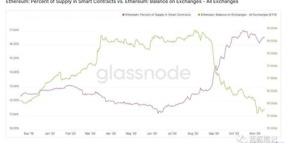 2017年以太坊基本上沒有什么實質生態,2017年以太坊火的是首次代幣發行。當時以太坊的主要用例就是首次代幣發行的融資。當時幾乎大多數的項目都只是概念,人們基于概念投資或投機。而這種泡沫來勢迅猛,但去也洶涌。當然,2017年的泡沫并非一無是處。2017年的牛市讓很多人看到區塊鏈和以太坊的潛力,看到除比特幣之外,還有其他區塊鏈的機會。同時,在這個時期,有一些項目獲得了融資,并堅持下來,為未來的以太坊生態繁榮打下基礎。像Chainlink、Aave、MakerDAO、Kyber、Loopring等不少項目都是在那個時期獲得了發展的資金。因此,2017年前后是以太坊生態的播種階段。在瘋狂的泡沫中,大多數項目煙消云散,一地雞毛,但有一些優秀的團隊,在以太坊的大地上播下了種子,并開始生根發芽。因為當時以太坊生態并沒有實際的價值支撐,在瘋狂的首次代幣發行泡沫退去之后,隨之而來的大規模下跌。經過了幾年的探索,如今的ETH已經有了堅實的生態支撐。其中最大的支撐就是DeFi生態的形成,目前整體DeFi市值超過160多億美元,有些協議有一定規模的用戶、交易量和費用收益。而對于ETH本身來說,大多數DeFi協議都鎖定了不同規模的ETH,ETH已經從融資媒介蛻變為底層的價值資產。如今DeFi對ETH形成強大需求:*DeFi中鎖定的ETH總量達到660萬個DeFi中鎖定了大量的ETH,達到660萬個,按照當前價值超過34億美元。除了以太坊,DeFi整體鎖定的資產量128億美元。DeFi正在形成對ETH越來越大的需求,在Unswap上,流動性最好的是ETH,交易量最多依然是ETH。隨著DeFi向縱深發展,例如去中心化期權等,ETH在DeFi中的需求只會越來越多。*DeFi生態的用戶目前DeFi用戶接近100萬左右,這里包括DEX、借貸、衍生品、保險、穩定幣、聚合器等等,這些都是真正在使用產品的用戶。
