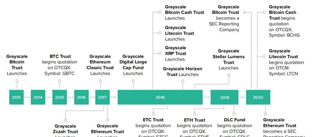 灰度投資公司的雛形是私募股權交易平臺SecondMarket公司旗下的一支比特幣投資基金。2014年,SecondMarket公司創始人BarrySilbert將這支比特幣投資基金從原公司中脫離出來,成立了灰度投資公司。2015年,灰度投資公司被歸并到新成立的數字貨幣集團旗下。DCG旗下除了灰度投資公司外,還有加密貨幣場外交易經紀商Genesis、區塊鏈媒體平臺CoinDesk兩家子公司,以及投資的150多個其他區塊鏈公司/項目。除了比特幣信托基金,灰度投資公司還推出了ETH,BCH,ETC,LTC,XRP等加密貨幣的信托基金,以及包含主流幣種的復合型加密貨幣信托基金。