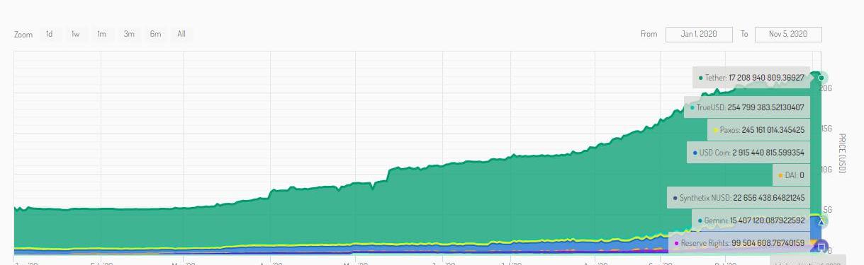 穩定幣市值來源:Messari加密數據平臺CryptoQuant首席執行官KiYoung-Ju表示,最近的加密貨幣價格上漲是由USDT等穩定幣的數量增加所推動的。他在11月5日指出:“再一次,比特幣價格在穩定幣的數量增加后立即飆升。”KiYoung-Ju之前曾在10月注意到這種相關性,并指出大量穩定幣的涌入“有助于預測比特幣價格的飆升”。CryptoQuant的數據還顯示,10月18日,流入交易所的穩定幣創下2020年新高,超過60000筆交易。不過,自那以來,此類交易的數量有所下降,然而到10月底,交易量約為30000筆。