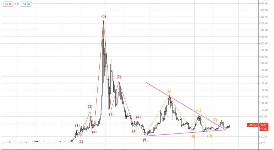 XRP/HKD+0.05%AAX研報本期重點關注LTC和BTC兩大熱門幣種。LTC長期分析下圖展示的是LTC的艾略特波動。和BTC一樣,LTC最近也從對稱三角形中正向突破。看漲趨勢信心滿滿,同時符合長期艾略特波動趨勢。