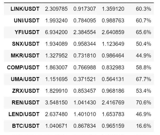 從最大跌幅數據來看基本都在50%左右。漲的最多的YFI跌幅相對而言不算最多,漲幅次多的REN跌幅卻是最大。從最近反彈的結果來看,大多數產品都回到了8月的點位,YFI,REN相對8月目前還有兩倍的漲幅,漲幅最大的也是這兩個項目。