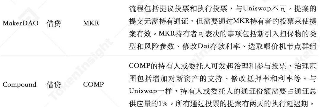 DeFi治理通證發行時間線;來源:TokenInsight治理通證的分配在一定程度上將項目治理權移交給參與者,弱化了核心開發團隊對網絡的控制權。參與者可通過持有通證或接受委托擁有管理項目的權限,而根據項目的不同,每種治理通證的權限執行規則也不盡相同。下表選取了幾個典型的DeFi項目,對其治理通證的權限進行說明。
