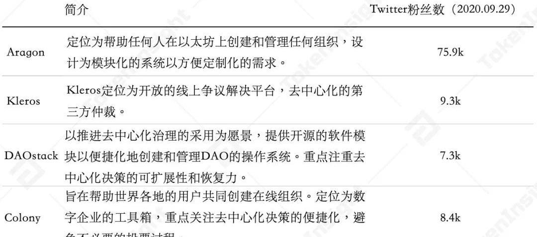 DAO項目市值;來源:Coinmarketcap,Coingecko,TokenInsightDAO項目的設計和定位是多樣化的。如前文所說,治理通證的發行即是項目創建DAO的一種形式。除外專注于賦能某個項目發展的DAO,還存在MolochDAO3這種著重于對以太坊2.0的資金使用和相關基礎設施的優化進行推動的項目。在此基礎上,又衍生出了如DXdao這類的主權集合體,對多個獨立項目進行集合的去中心化管轄和賦能。相比之下,Aragon、Kleros、DAOstack和Colony一類的項目,其角色則是為DAO的創建和管理提供基礎設施和工具。比方說DAOstack為DXdao提供了底層技術框架;Aragon已幫助眾多的項目創建了DAO,其中不乏主流DeFi和NFT項目,如Aave、Curve、pNetwork、Decentraland和Aavegotchi等。下表為幾個DAO基礎設施和工具的簡介和當前社區熱度。
