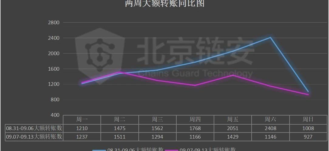 大額轉賬數:08.31-09.06:1148209.07-09.13:8710較之前一周下降:24.14%詳細數據圖如下: