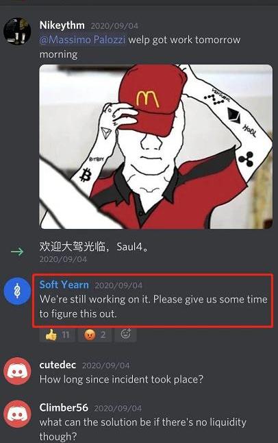 上面是官方Discord群中的精彩留言,“所以,你們說的錨定0.003YFI,現在是0.003$”這就是那個bug嗎?另一位網友說,“明天要開始工作了”然后發了一個麥當勞小哥的圖,小哥手臂上紋身是各種數字貨幣。