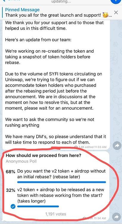 騷姨夫SYFI團隊還沒有跑路,雖然大家不能再投資了,雖然已經投資的人已經歸零了。但是團隊告訴我們他們在做事,而且有模有樣地搞起了投票——主要是關于V2要不要rebase。不要rebase的人數占優勢,所以今天就發了下面的圖片。備注:如果不理解什么是rebase的朋友,可以搜索關鍵詞“yamrebase”