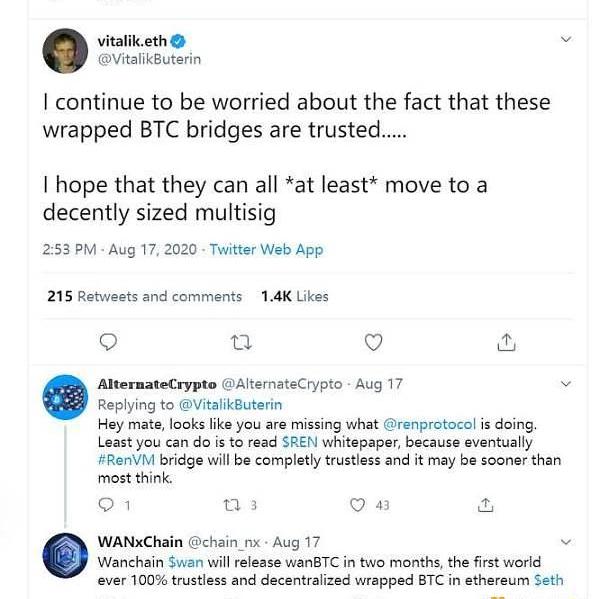 XRP/HKD+0.66%編者按:本文來自金色財經,Odaily星球日報經授權轉載。首先這個話題不是筆者一個人的顧慮,今年8月17號,以太坊創始人Vitalik在推特上發文:「我依舊很擔心這些發在以太坊上的BTC映射代幣到底靠不靠譜?」言下之意,現在以太坊上有各種加字母的BTC代幣,但是到底是不是真正「去中心化」且安全的方案呢?