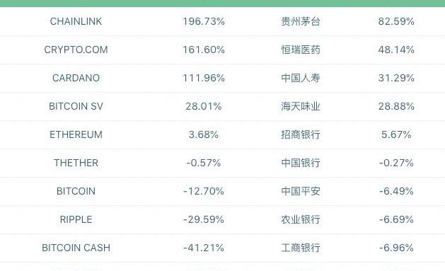 一般來說,需要至少30年,才能對股票的風險和預期回報作出有用和現實的預測。不幸的是,木桶效應決定了短板在于數字貨幣并沒有這么長的歷史。這項研究的數據僅包括市值前十的數字貨幣365天的歷史價格,與其相比較的是A股市場市值排名前十的股票365天的歷史價格。具體來說,從2019年7月13日到2020年7月13日,每天的股票收盤價都會被追蹤。截至2020年7月,兩個市場前十市值的標的如下所示:
