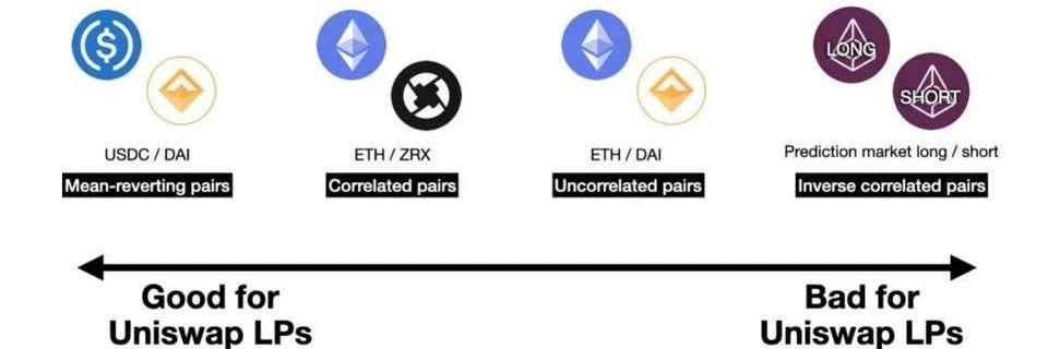 均值回歸交易對的情況很明顯。相互關聯的交易對,其價格往往一起移動,因此Uniswap不會有太多套利損失。而像ETH/DAI這樣不相關的交易對,情況就不太確定,有時候交易費可以彌補損失。最右邊是逆相關的交易對,Uniswap上這種資金池就很糟糕了。想象一下,有人在某個預測市場做多特朗普,做多拜登,并將兩筆押注放入Uniswap的一個資金池。從定義上說,最終將有一筆資產值1美元,另一筆資產則為0。該資金池的結果是,某個LP一無所獲,只有套利損失!所以,Uniswap對某些交易對運轉良好,而對另一些交易對而言就是災難。但是人們很容易發現,到目前為止,幾乎所有頭部Uniswap資金池都是賺錢的!實際上,甚至ETH/DAI資金池自創建以來也是賺錢的。