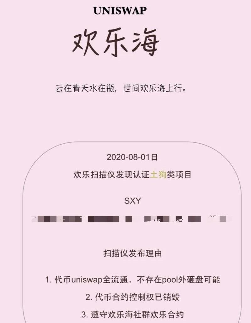 與動輒百倍、千倍的漲幅比起來,Uniswap上的交易量并不高,往往只有幾萬美金。在交易量并不高的前提下,漲幅百倍、千倍都是虛假的幻像。“現在的Uniswap就像之前的傳銷,只不過是去中心化的。”牛蕓說,都是一摸一樣的套路,靠拉人頭來接盤。所以Uniswap也被成為群里的互割生意。“買的人越多收益越大,沒有項目方沒有上幣費,全靠韭菜的力量。”牛蕓透露。6小時一個項目,投資者目不暇接,這個項目名還沒認全,隨即開始下一個項目。與中心化世界的項目方、Tokenfund、交易所、做市商等配套資源不同,Uniswap的世界,社群是最強大的組織。一個叫做歡樂海的社區,據稱建群一天就滿了。推薦的第一期項目SXY,最高上漲700倍,但截止寫稿時,SXY價格距離高點已經腰斬,24小時交易量大跌92%。