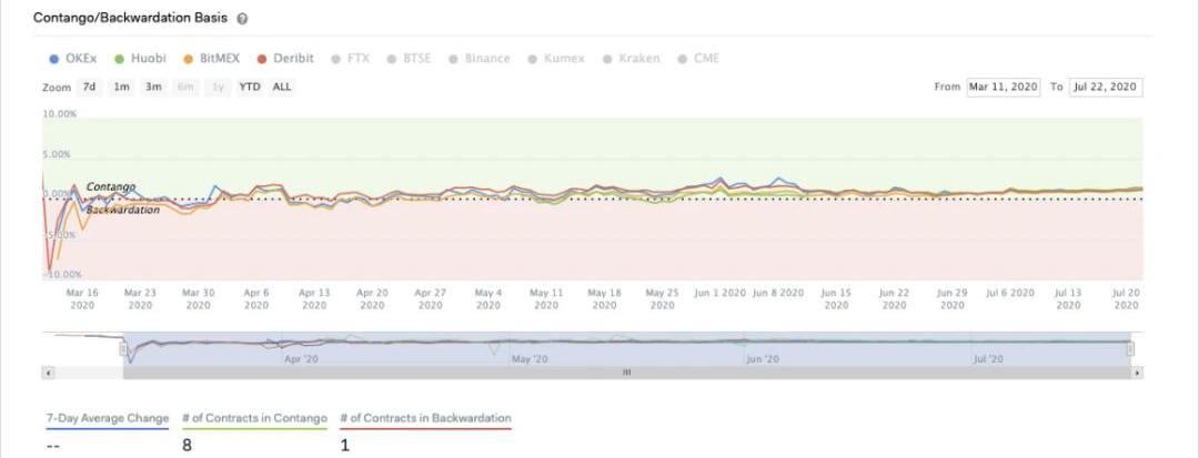 另一個觀察投資者定位變化的方式可以從傳統的期貨溢價和現貨溢價角度來看。3月12日的時候,期貨價格相對于現貨價格有很大的折損。但現在情況發生了逆轉,在9月25日到期的9個合約中,只有一個對比特幣進行了折價。處于期貨溢價中的合約數量增長表明目前衍生品投資者的共識是看漲。