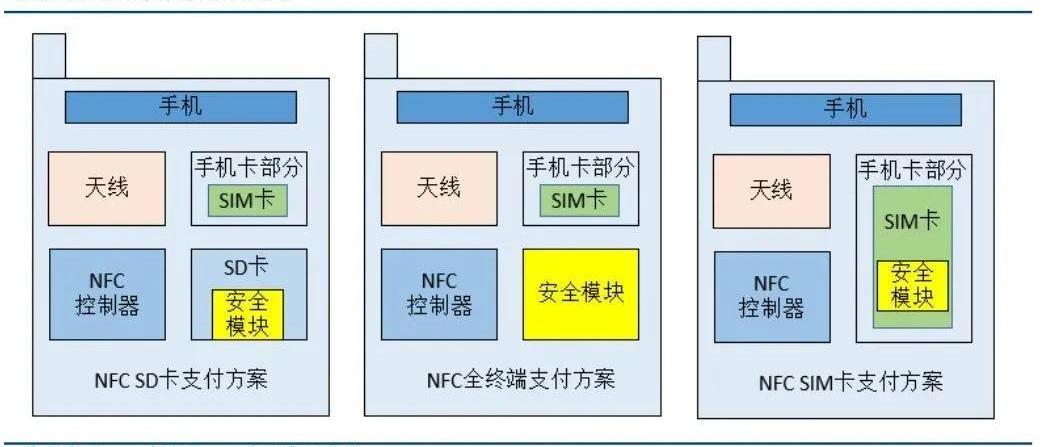 3.1NFC+SIM卡是NFC移動支付的主流模式NFC支付系統的核心是SE安全模塊。NFC支付系統組成部分包括安全單元、NFC前端及OTA:安全單元SE負責確保支付系統的安全,SE可以是固化在手機中也可以存在于SIM卡、SD卡這樣的可拆卸裝置中;NFC前端芯片通過連接的天線負責無線通訊;OTA空中下載控制部分負責對于存儲在SE中的NFC支付應用的下載和管理。其中,SE安全模塊是金融賬戶的載體,也是NFC支付系統的核心,運營商、銀行和手機廠商都在爭奪SE模塊的控制權。因此,SE安全模塊的載體可以有SIM卡、SD卡、內置在手機硬件中等。2013年底安卓操作系統4.4以上版本支持了HCE(host-basedcardemulation,主機卡模擬)技術,該技術使基于操作系統應用軟件直接實現卡模擬技術成為可能,不再要求手機中必須存在安全單元。