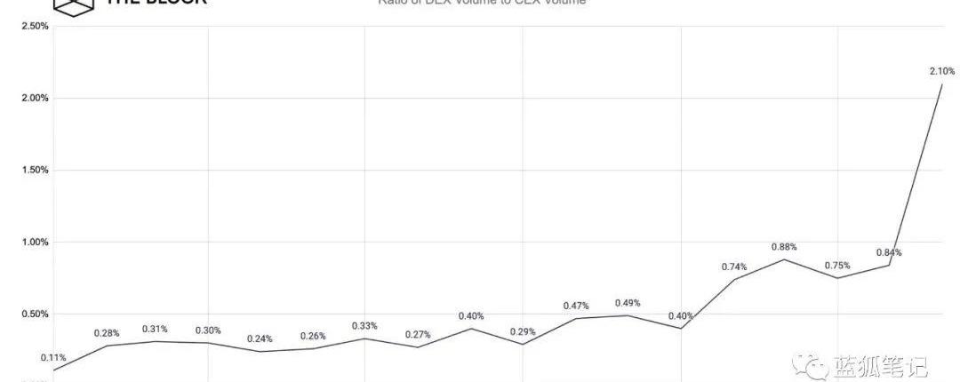 即便是為Balancer、Curve、Uniswap、Bancor、Thorchain等提供流動性的是少數鯨魚或機構,只要對于普通交易用戶來說,能夠順利交易自己想要的代幣,且滑點低,流動性好,DEX就有可能從實質上成為CEX的對手。流動性挖礦足以成為DEX的第一推動力,推動它脫離“地球”引力,推向它直面CEX的強大。DEX的交易量從無足輕重到如今超過CEX的2%從交易量來看,DEX已經超過CEX比例的2%,這是一個非常重要的突破。DEX雖然很小,但已經聚集了足夠的流動性。這個流動性能夠帶來良好的用戶交易體驗,加上用戶可以自由掌握代幣的流向,一旦習慣了DEX的交易,用戶可能反而不習慣CEX的交易體驗。2%只是開始。