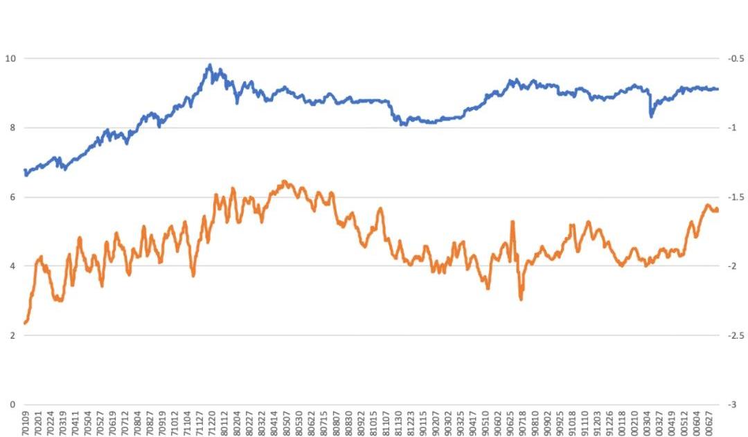 數據來源:OKEX將比特幣7日收益率與BVC情緒指數畫在同一張圖中,不難發現由于比特幣日均收益率的降低,情緒指數與波動隨之降低。說明投資者情緒平穩,在主流幣上的投機情緒不是很重,也側面說明近半月的市場關注度不在比特幣等主流幣種上。