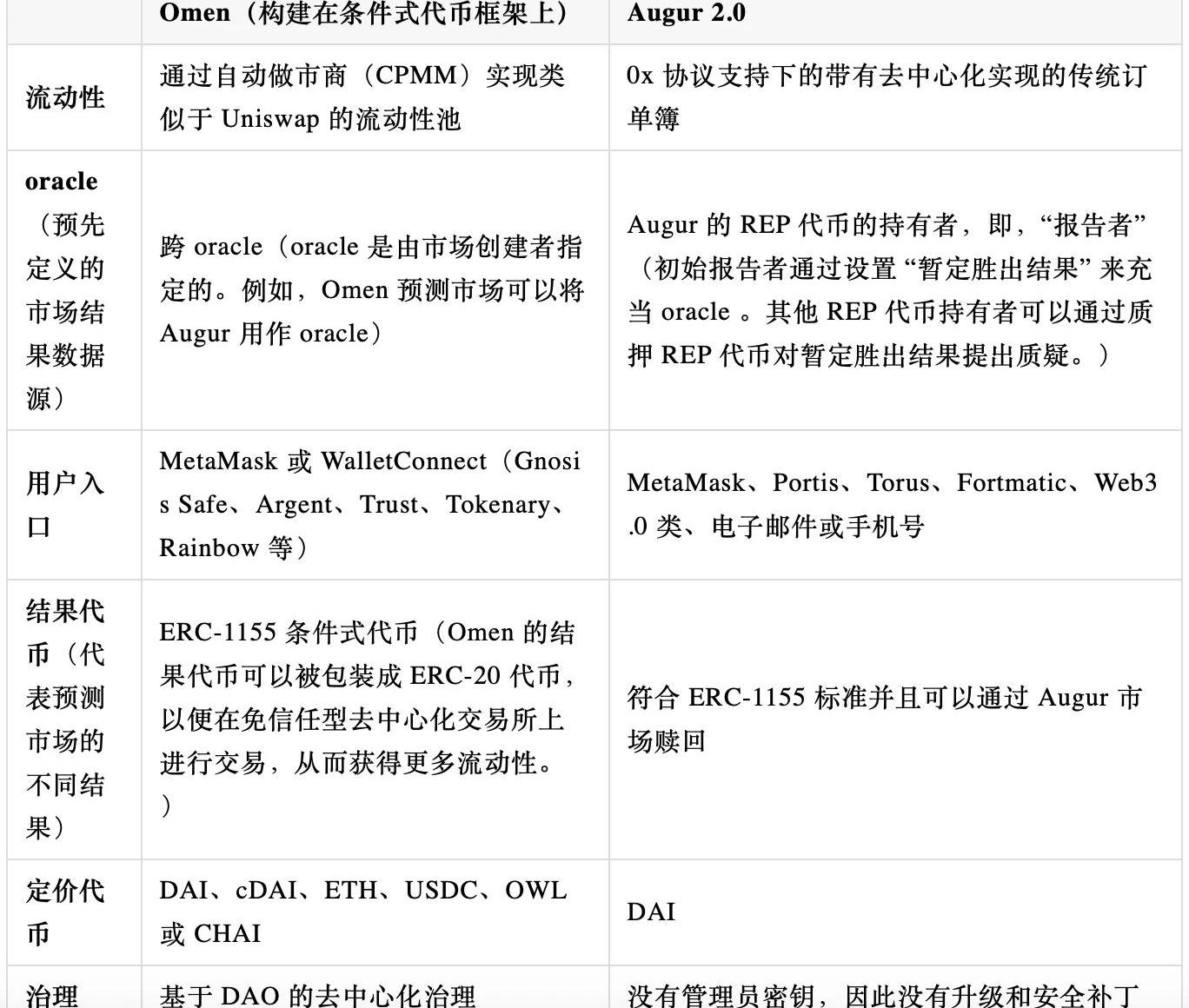 雖然Gnosis和Augur均以去中心化作為核心價值觀,但是二者在構建預測市場基礎設施的方法上存在一些主要區別。在由Gnosis開發的條件式代幣框架上,DXdao推出了具有增強流動性、模塊化特性和免許可型互操作性的預測市場平臺Omen。Augur則另辟蹊徑,從oracle角度解決了預測市場的“信任”問題。Augur設計的核心在于擁有去中心化的oracle。Augur的REP代幣的持有者被稱為“報告者”,他們能夠影響預測市場的決議結果。當某個預測項目的決議日過后,由初始報告者——REP代幣持有者,通常也是市場創建者——設置市場的“暫定勝出結果”,其他REP代幣持有者可以質疑該結果,并在另一個結果上押注REP代幣。通過將經濟激勵和爭議窗口期機制相結合,Augur的oracle系統成功創建了一個去中心化報告池,將現實世界發生的事件記錄到以太坊區塊鏈上。這是Augur的設計中非常有用的一點。實際上,Augur的oracle系統可以擔任Omen預測市場決議結果的仲裁者。考慮到流動性,Augur2.0版本的預測市場采用了由0x協議支持的鏈下訂單簿。該訂單簿實現在鏈下收集訂單,然后在鏈上進行結算。雖然訂單是通過0x協議3.0版本支持的高效發現機制在點對點網絡上共享的,但是該系統仍依賴于同步的代幣對訂單。相比之下,Omen之類的自動做市商則針對代幣對創建了類似于Uniswap的大型流動性池。下表更加全面地對比了Omen和Augur2.0: