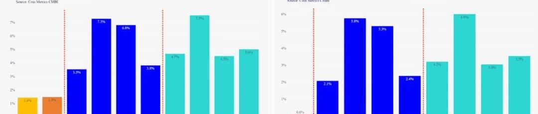 所有的CMBI和Bletchley指數都表現強勁,其中多資產指數表現最佳。CMBIBTC指數和CMBIETH指數分別微升1.4%和1.5%。Bletchley20的收益最高,一周上漲了7.3%,而Bletchley40緊隨其后,回報率為6.8%。