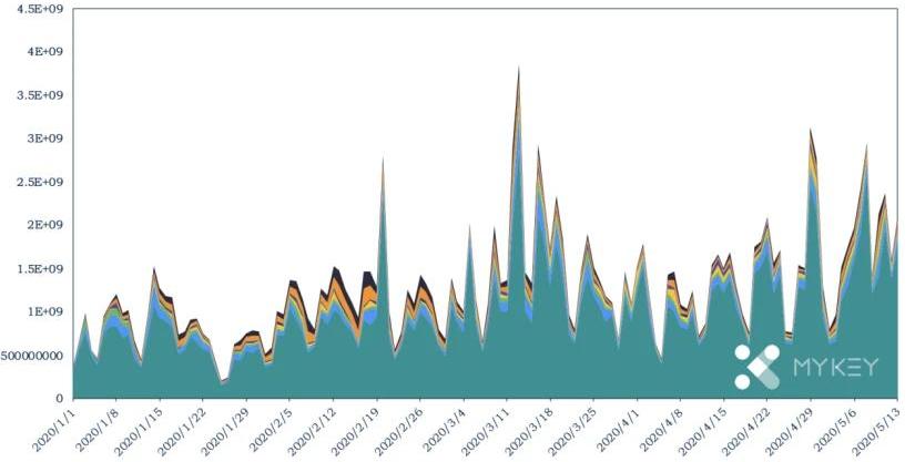雖然穩定幣的市值有所下降,但以太坊網絡中穩定幣的持幣地址數依然保持上升。上周上圖中穩定幣在以太坊網絡中持幣地址共增加了115,598個,其中主要來自USDT,增加了103,338個;其余USDC、PAX和DAI增加較多,分別增加了3,515、5,059和3,329個。我們判斷,USDT新增地址遠超其他穩定幣,很可能得益于它在幣圈外更廣泛領域的采用。