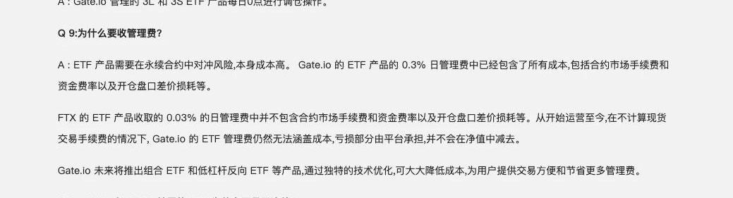 來源:Gate.ioGate交易所的杠桿ETFBTC3L/USDT也有同樣的追蹤問題,整體來看,Gate交易所杠桿ETF隨著幣價的上漲,追蹤倍數正在逐漸增加,這更像是沒有進行每日調倉或者其ETF背后進行調倉的基礎資產為合約而不是現貨。對此,Gate.io在產品文檔中給出了如下解釋:「ETF產品需要在永續合約中對沖風險,本身成本高。Gate.io的ETF產品的0.3%日管理費中已經包含了所有成本,包括合約市場手續費和資金費率以及開倉盤口差價損耗等。FTX的ETF產品收取的0.03%的日管理費中并不包含合約市場手續費和資金費率以及開倉盤口差價損耗等。從開始運營至今,在不計算現貨交易手續費的情況下,Gate.io的ETF管理費仍然無法涵蓋成本,虧損部分由平臺承擔,并不會在凈值中減去。」