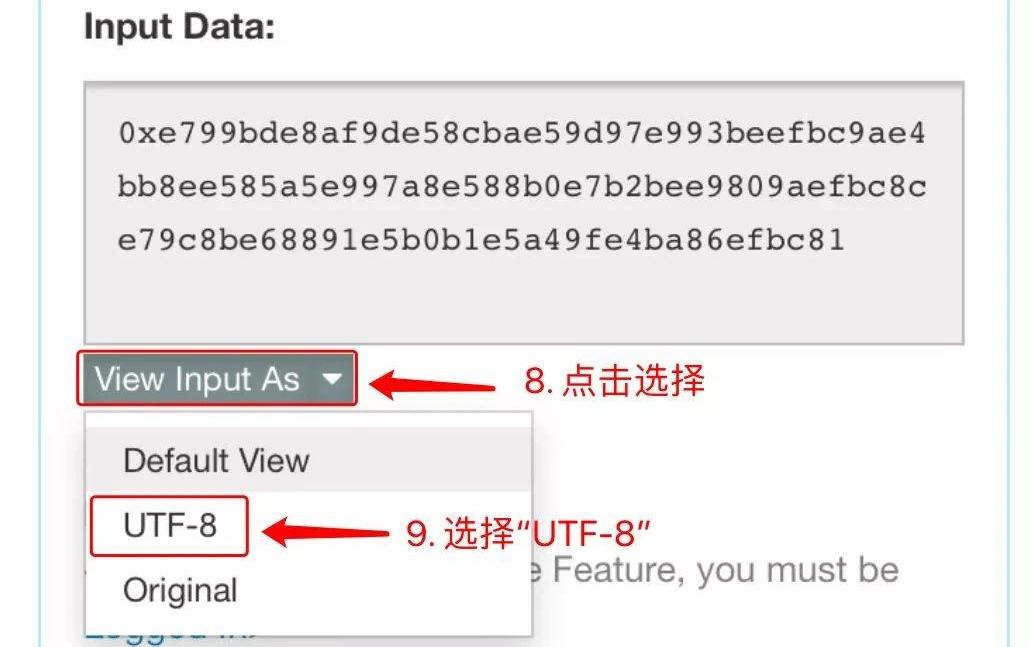 如果你是用手機打開「Etherscan」鏈接,打開網頁后往下翻,找到下圖所示的「InputData」,然后選擇「UTF-8」,字符就全部轉換為我們想刻在區塊鏈上的文字了。