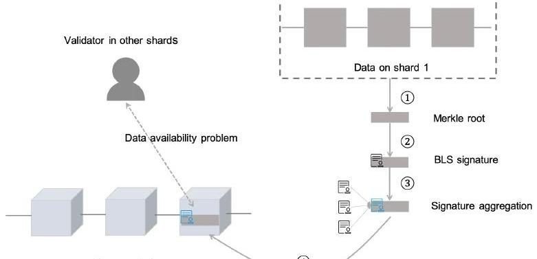 整體過程可用以下步驟說明:1.分片數據以Merkle結構存儲得到Merkle根。事實上這是交聯數據根,為簡便起見,將其稱為Merkle根。2.提議人節點生產新區塊并對Merkle根進行簽名;3.其他驗證人節點對此區塊進行投票并簽名。其中,BLS簽名可聚合成一個簽名;4.當簽名的數量超出門限時,簽名的Merkle根就會被添加到信標鏈上。在其它分片上發揮作用的分片無法獲知完整的區塊鏈數據,并且也不會去下載,否則,這會直接消除分片所帶來的優勢。這種情況下的數據可用性問題指的是,如何能夠驗證分片1中的數據確實可被任何想要下載或驗證此數據的全節點所獲取。3.托管策略