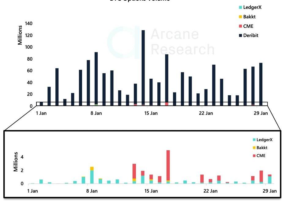 XRP/HKD+1.43%編者按:本文來自財經網鏈上財經,作者:奚習習,Odaily星球日報經授權轉載。談及比特幣衍生品,最受關注的莫過于芝加哥商品交易所和美國洲際交易所集團旗下加密貨幣衍生品交易所Bakkt,二者均已推出了自己的比特幣期貨和比特幣期權產品。近期有研究顯示,盡管比特幣期權在機構投資者中越來越受歡迎,但該領域主要由不受監管的參與者主導,而不是CME和Bakkt這類受監管的交易所主導衍生品交易所。比特幣期權:1月合規交易所持倉量占比不足7%