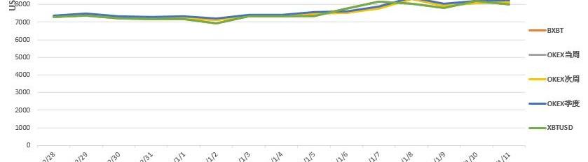 資料來源:Alternative.me,TokenMania本周比特幣波動率指數呈沖高回落走勢,較上周同期上漲62.66%,開盤值1.58,最高值4.61,最低值1.50,收盤值2.57,收盤值較上周同期上漲62.66%;恐懼&貪婪指數上周同期為38點,本周最高51點,最低39點,恐懼&貪婪指數最新點位50,較上周同期38點增加12點,隨著比特幣向上突破創下近期新高,投資者情緒由恐懼轉為中性。7.期貨合約:短期期貨貼水轉升水,多空預期切換頻繁從期貨合約的角度來看,本周期貨價格震蕩走高,市場主動交易活躍度大幅提高,投資者多空預期切換頻繁,尾盤由貼水轉為升水狀態。從期限結構上來看,本周OKEX的當周合約價格平均貼水0.18%;次周合約價格平均貼水0.23%;季度合約平均升水1.13%,升水幅度下降0.65個百分點;BitMEX永續合約平均貼水0.01%。根據合約最新收盤價格,本周OKEX的當周合約價格由貼水轉為升水,最新升水1.11%;次周合約價格最新升水1.26%;季度合約最新升水2.75%,升水幅度上升1.67個百分點;BitMEX永續合約最新升水0.02%;截至統計時間,BITMEX永續合約多空對比為53.00%:47.00%,多頭資金相對占優。綜合來看,本周比特幣期貨平均貼水幅度減小,投資者短期看空情緒有所緩和,市場看多情緒逐漸抬升。圖15近兩周比特幣期貨與現貨價格走勢