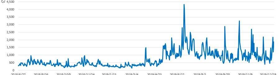 資料來源:非小號,TokenMania從更長的時間維度來看,19年一季度九大交易所日交易量基本處于400億元上下區間震蕩,二季度交易量在4月初放量突破1400億元,5-6月市場成交量連創新高,九大交易所日交易量一度突破4300億元高點;7月以來市場成交量呈現持續震蕩縮量態勢,日均交易量均值降低到1000億元以下;10月底比特幣快速拉升一度突破10000美元上方,日成交量突破3000億元創下高位,而后市場成交量再次呈持續回落態勢;受監管趨緊影響,11月底幣價在恐慌中一度放量下跌,隨后日成交量持續萎靡,最近兩周受避險情緒升溫影響,BTC價格寬幅震蕩,交易量同步有所放大。考慮到目前各大交易所存在刷量的行為,實際成交數據可能低于統計數據。全球比特幣場外交易量增加3.68%至2866.1萬美元,中國比特幣場外交易量增加19.28%至939.9萬元,委內瑞拉比特幣場外交易量增加38.03%至3634.5億玻利瓦爾,依據當前委內瑞拉玻利瓦爾和人民幣兌換比例計算,最近一周場外BTC交易量約3743.223萬元;前一個統計周按當時匯率計算的場外BTC交易量約3373.021萬元,最近一周較前周增加10.98%。圖5LocalBitcoins全球交易量