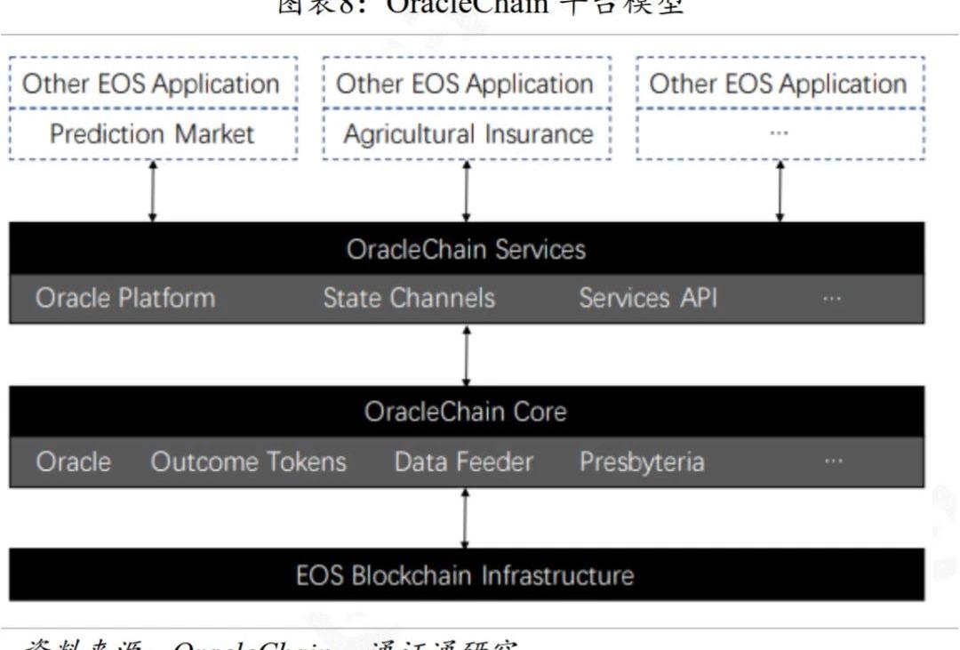 DOSNetwork是一個Layer-2的預言機解決方案,由鏈上和鏈下兩部分構成。智能合約指明合約需要的數據源以及數據類型,向鏈上系統合約發送一個預言機請求,接著該請求會被隨機分配給一個鏈下工作組。工作組內的每個成員節點都會從指定的數據源獲取數據并按照規定的類型和結構來解析。隨后組內節點通過閾值密碼學的方式對數據結果達到組內共識并且產生一個對共識結果的證明。經過組內共識的數據和相應的證明將會以一條交易的方式發回系統合約,并觸發合約對提交組返回結果證明的驗證。DOSNetwork認為基于聲望來選擇服務節點容易因“馬太效應”造成中心化問題,因此采用隨機的方法來選取預言機工作組合節點。DOSNetwork基于可驗證隨機方程和閾值密碼學的方式產生安全、無法被預測并且可以被公開驗證的隨機數,避免了聲望系統的種種問題,對參與節點更加公平公正。4.4OracleChainOracleChain是基于EOS平臺面向EOS生態的非中心化預言機平臺。OracleChain采用PoRD的雙效機制,本質上是一種抵押保證金的聲譽系統,獎勵善意節點,懲罰惡意節點。