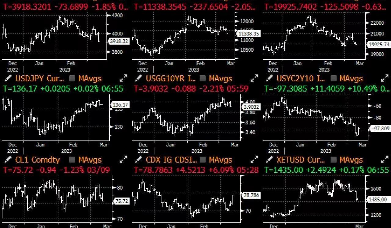 再次證明意想不到的后果總是最嚴重的,美聯儲為打擊通脹而進行前所未見的激進加息,可能導致資本充足銀行的資產負債表上出現巨大的資本缺口,而由于美國SEC對加密貨幣的打壓以及Silvergate清算的影響,這些銀行的資產負債表現在備受關注。此外,一如既往地,固定收益市場敏銳地察覺到第一個可能最終迫使美聯儲不再那么鷹派的跡象出現,終端利率下降了22個基點,市場預測3月份加息50個基點的可能性也從前一天的高點65%跌至50%左右。