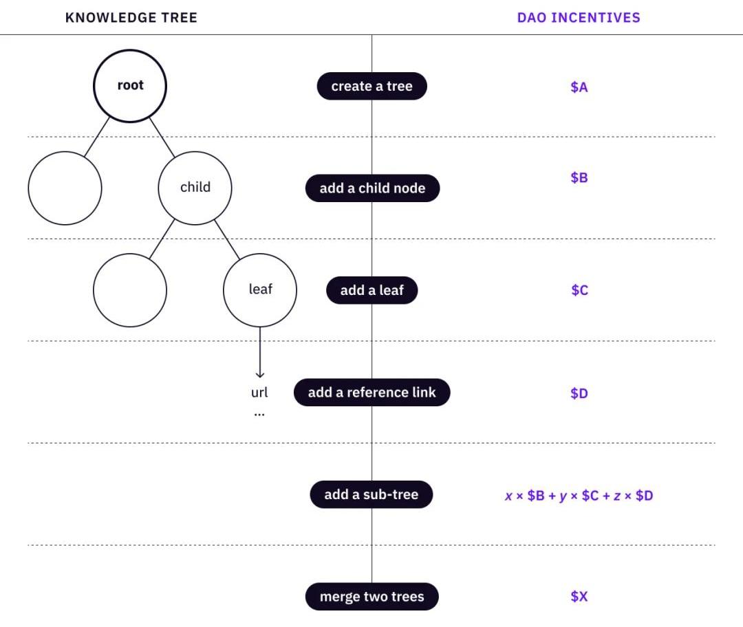 在知識樹的情況下,DAO的貢獻者可以創建一個根,添加一個知識路徑,并為樹葉添加參考鏈接。激勵機制創建了一套規則來獎勵那些采取可驗證的行動來規劃和種植知識樹的社區貢獻者。