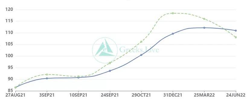 以太坊RV下降到近期最低水平,僅有70%,這說明波動性下降的很快。同時由于以太坊沒有關鍵點位的爭奪,各期限IV都出現了明顯回落,但中遠期期權IV受影響較小。