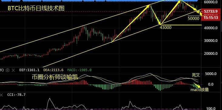 周初的時候談老師就在文章之中寫到“日線背離”這樣的感覺讓人似曾相識,所以對本周的操作思路一直很謹慎,直至幣價有效跌破55000美元關口之后,才及時轉變思路。消息面上主要是因為本周有三大利空因素:美國國債收益率上升、Bitfinex的看跌走勢以及風險偏好市場的掙扎,這一點談老師在文章之中也強調過。其次就是技術面跌破BOLL中軌位置。前天隨著幣價徹底打破上周的低位之后,更是堅定了自己的思路。凌晨階段至今日亞盤行情持續性下破至51500美元一線,空頭趨勢愈演愈烈,甚是有望回撤50000美元關口。