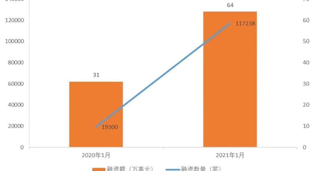 圖1:2021年1月區塊鏈投融資數量及金額走勢
